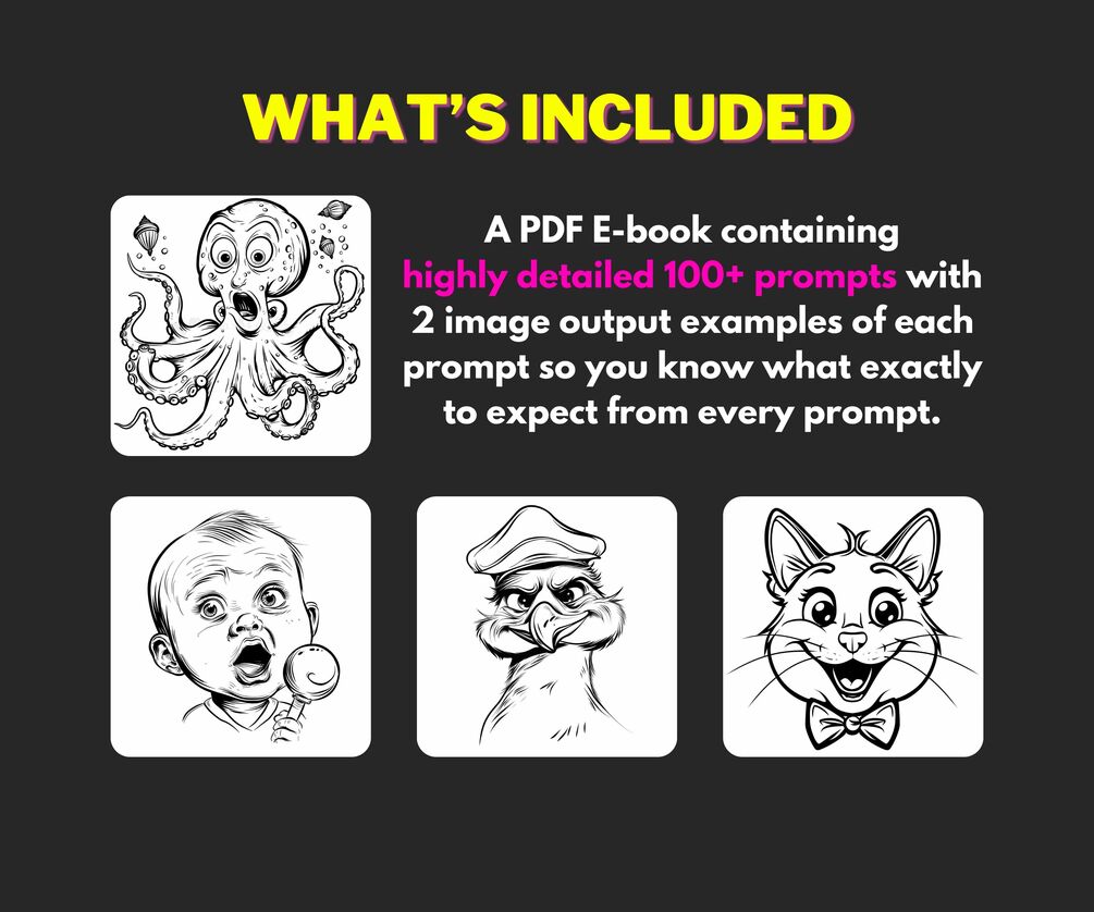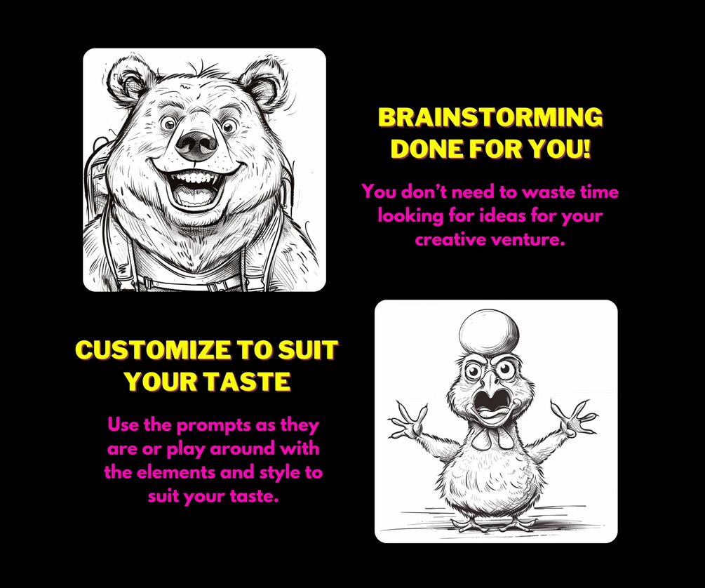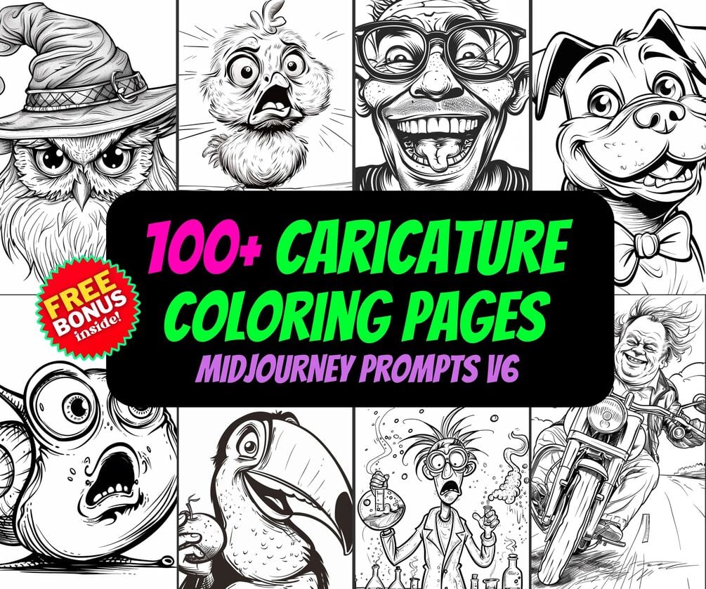 PDF file with 100+ Caricature Coloring Midjourney v6 Prompts