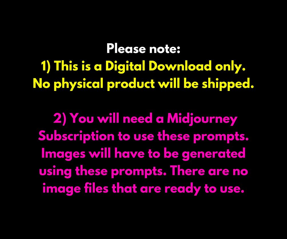 This product features Midjourney prompts designed for AI art and graphic design, not standalone PNG images. The displayed images serve as examples of designs you can create using the prompts provided.