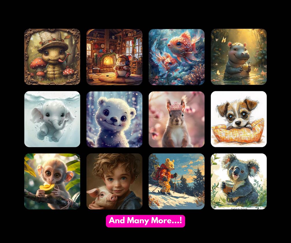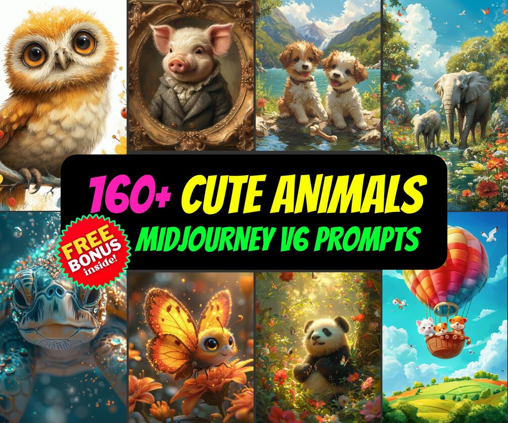 Unleash your artistic prowess with our "160+ Cute Animals Midjourney Prompts," crafted for creatives, parents, and anyone captivated by charming, high-detailed animal caricatures. This versatile package is not just a creative tool but an invaluable resource for your commercial endeavors, offering a seamless blend of digital art, customizable designs, and print on demand possibilities. Immerse yourself in the world of AI creativity with Midjourney prompts designed to inspire unparalleled masterpieces.