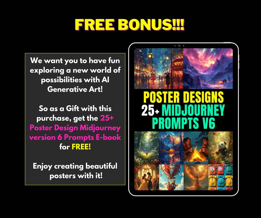 ✨ Bonus Midjourney Content: As a bonus, receive more than 25 Midjourney Prompts for Commercial Poster Designs.